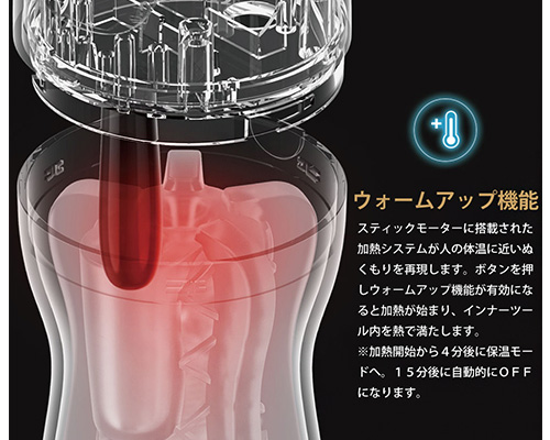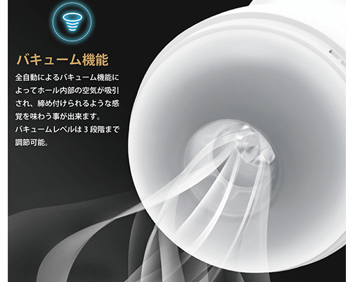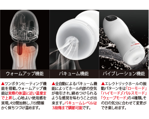 ウォームアップ機能と三段階のバキューム機能・4種類のバイブレーション機能であなたの好みに合った最高の気持ちよさを再現します。